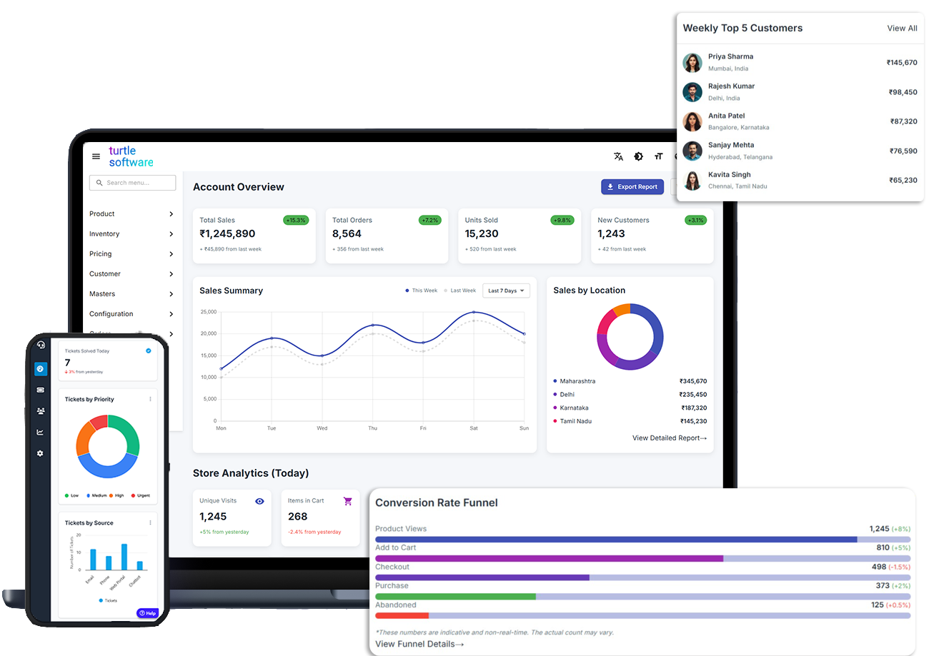 Turtle Sales Suite provides a comprehensive suite of tools to manage every aspect of your business, from e-commerce and customer relationships to service delivery and analytics.